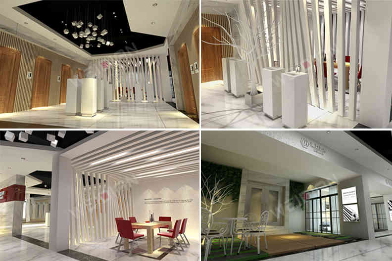 整個(gè)展臺設(shè)計(jì)方案簡潔大氣,外觀與陳列展示的修飾沒有過度消費(fèi),塊面直線條干凈利落,玻璃和鏡面不銹鋼營造空間的通透和延伸,簡約質(zhì)樸的材料做出優(yōu)雅和品味,更能適應(yīng)現(xiàn)代未來高效快捷的特點(diǎn)。合理明智的選材及完美的運(yùn)用使整體看起來極具品質(zhì)感,設(shè)計(jì)師還注重生態(tài)的營造,綠化穿梭連貫活潑