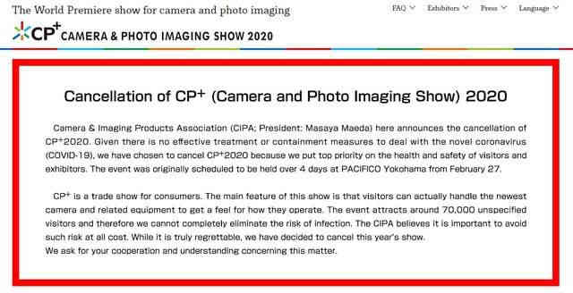 原計(jì)劃于2月27日-3月1日在日本橫濱太平洋橫濱展覽中心舉辦的日本國際攝影器材與影像博覽會(huì)CP+ 2020已與官網(wǎng)宣布取消。